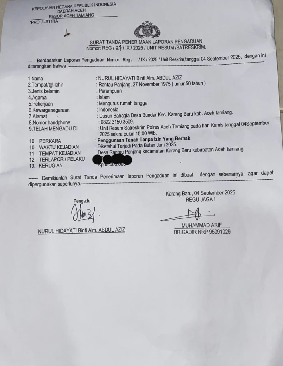 Oleh karena itu sambung Nurul, karena kami 3 (tiga) bersaudara yang telah menjadi Korban atas tanah kami, dari perbuatan orang yang tidak bertanggung jawab, untuk itu kami mencari Keadilan Hukum dengan mengadukan (melaporkan) Pemangku jabatan Kampung (Datuk Penghulu) ke Pihak berwajib Polres Aceh Tamiang, tepatnya Kamis 04 September 2025 sekira pukul 15.00 Wib, dengan bukti Surat Tanda Penerima Laporan Pengaduan nomor: REG/37/IX/2025/ UNIT RESUM/SATRESKRIM. Atas Perkara Penggunaan Tanah tanpa Izin yang berhak. Terlapor Inisial AJ.