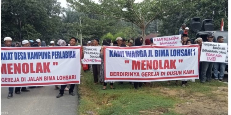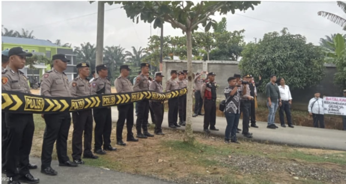 Labuhanbatu Selatan – Polres Labuhanbatu Selatan melakukan pengamanan terhadap aksi unjuk rasa damai yang dilakukan oleh puluhan masyarakat warga Desa Kampung Perlabian Kecamatan Kampung Rakyat Kabupaten Labuhanbatu Selatan sebagai respons terhadap rencana pembangunan gereja dijalan Bima Lohsari Desa Kampung Perlabian, Senin (18/12/2023).