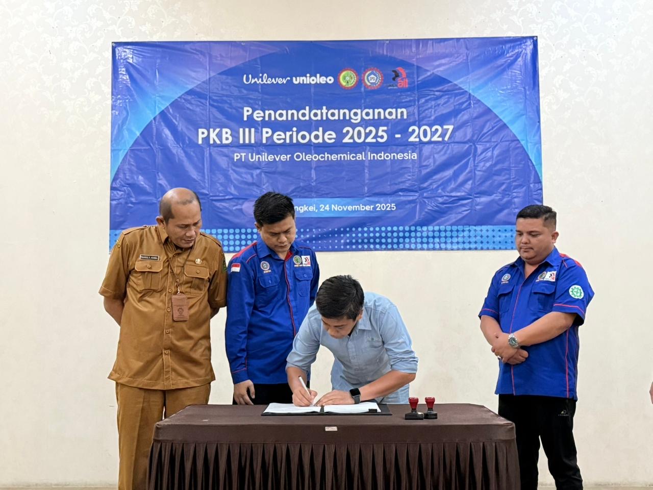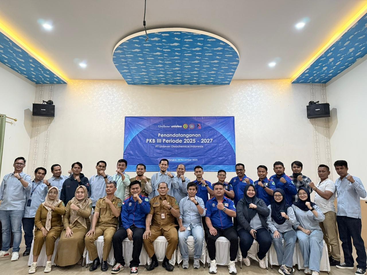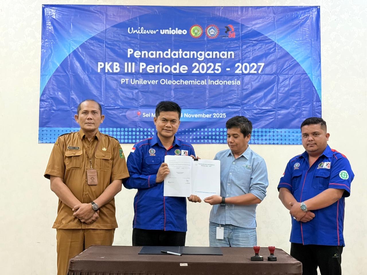 Simalungun-tuntasnews.net – Perjanjian Kerja Bersama (PKB) KE III periode (2025-2027) Pada Managemen PT.Unilever Oleochemicals Indonesia(PT.UOI) Kabupaten Simalungun dengan Pimpinan Unit Kerja Serikat Pekerja Kimia,Energi Dan Pertambangan Serikat Pekerja Seluruh Indonesia (PUK SP KEP SPSI PT.UOI) yang di pimpin Ketua Haditio Sugihan, Sekertaris Aditya Ananta ,Bendahara Reza Maulana Putra, dan Wakil Ketua I s/d IV, I.Zaenal Zuhri Tanjung, II. Sabda Felix RS, III.Raja Kasto Simangunsong, IV.Nathalin Iktafrida Situmorang, telah sukses hingga Penandatanganan berlangsung dengan baik pada hari Senin Tanggal 24 November 2025 di StarPark Kecamatan Bandar nagori Perdagangan II Kabupaten Simalungun, berawal dari permohonan Pengurus PUK SP KEP SPSI PT.UOI kepada Dinas Ketenagakerjaan Kabupaten Simalungun agar terlaksananya PKB ke III bersama Managemen PT.Unilever Oleochemicals Indonesia hingga Penandatanganan PKB ke III secara Sah.