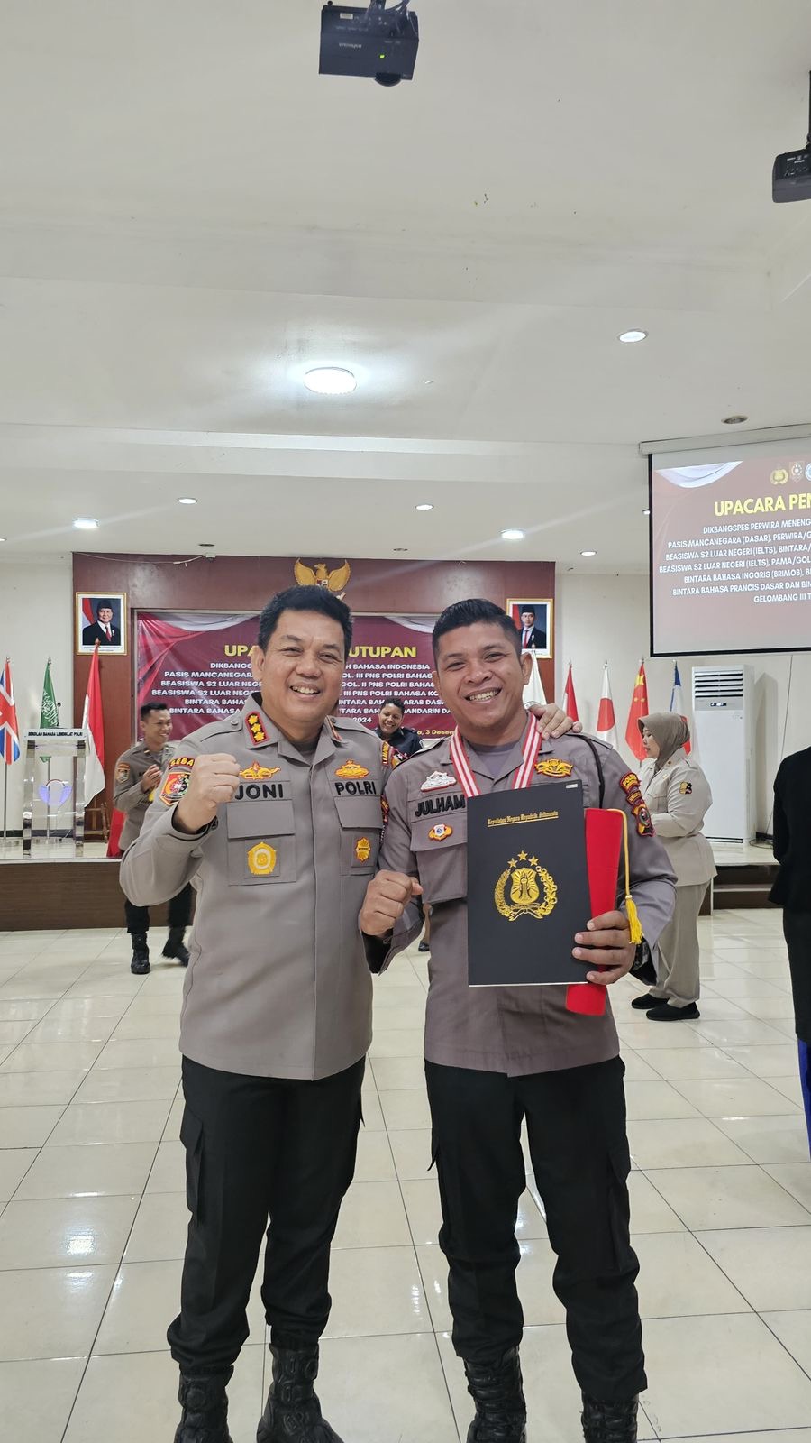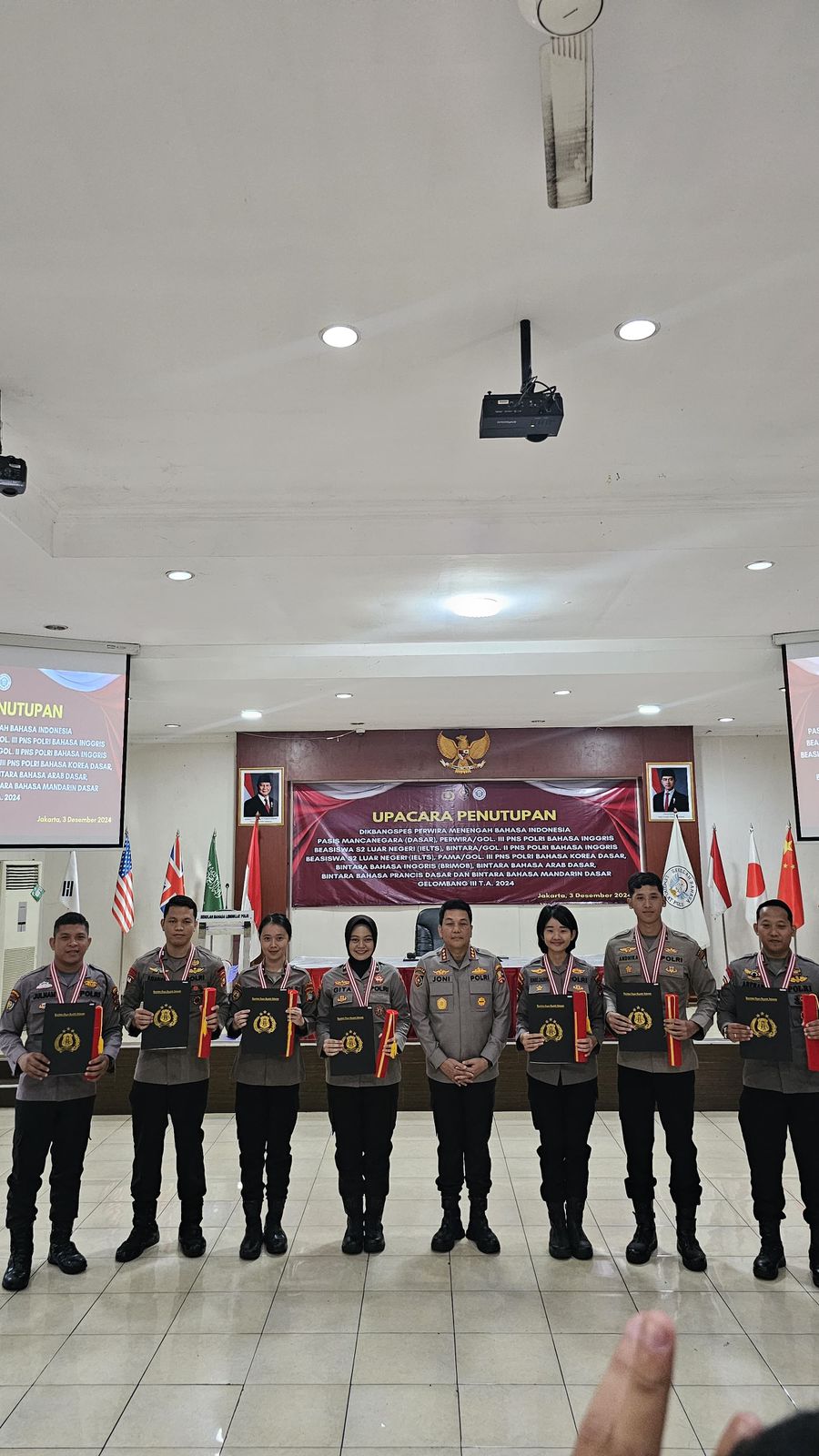 Dalam acara ini, Kepala Sekolah Bahasa (Kasebasa) Lemdiklat Polri, KOMBES Pol Joni Getamala, S.H., menyerahkan penghargaan kepada para juara di masing-masing kelas bahasa.