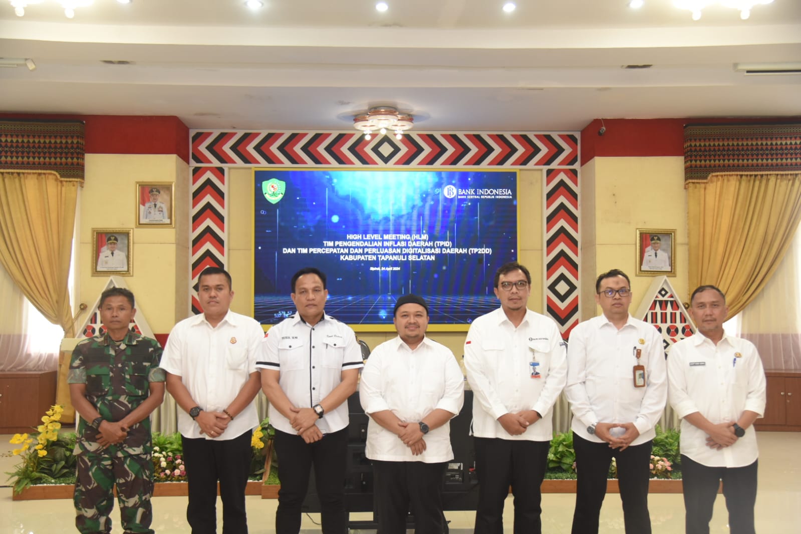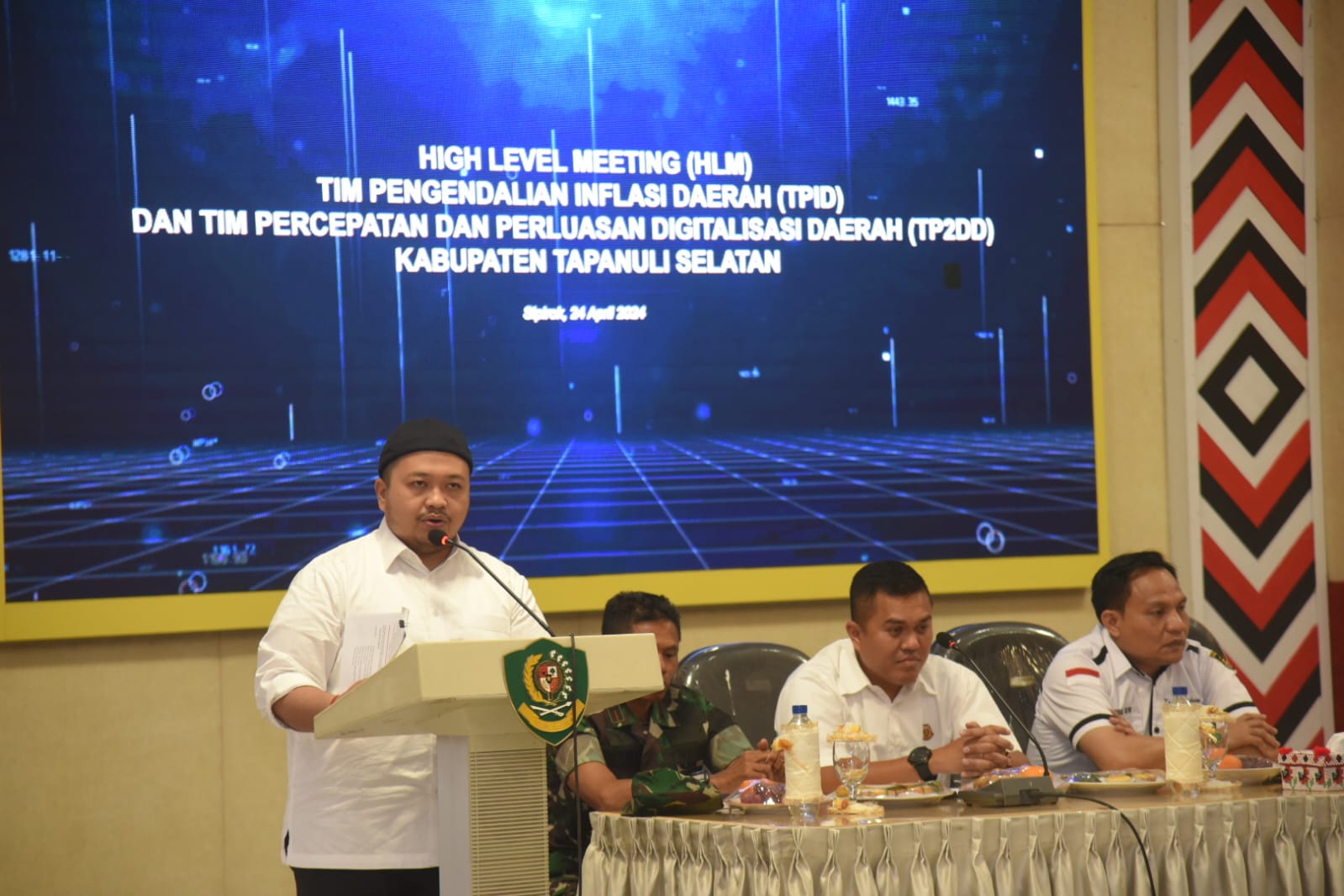 TAPSEL – Bupati Tapanuli Selatan (Tapsel) Dolly Pasaribu membuka secara resmi High Level Meeting (HLM) Tim Pengendalian Inflasi Daerah (TPID) dan Tim Percepatan dan Perluasan Digitalisasi Daerah (TP2DD) Kabupaten Tapanuli Selatan di Aula Sarasi, Lantai III, Kantor Bupati Tapsel, Jalan Prof. Lafran Pane, Sipirok, Rabu (24/4).