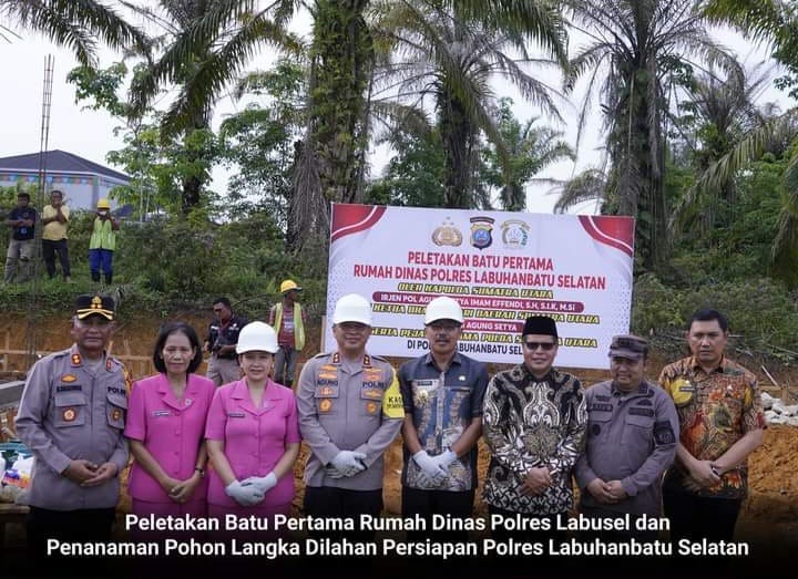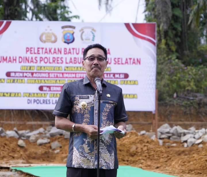 Labuhanbatu Selatan – Bupati Labuhanbatu Selatan (Labusel) H. Edimin hadiri acara peletakan batu pertama rumah dinas Polres Labusel dan penanaman pohon langka dilahan persiapan Polres Labuhanbatu Selatan, Kamis (25/4/2024).