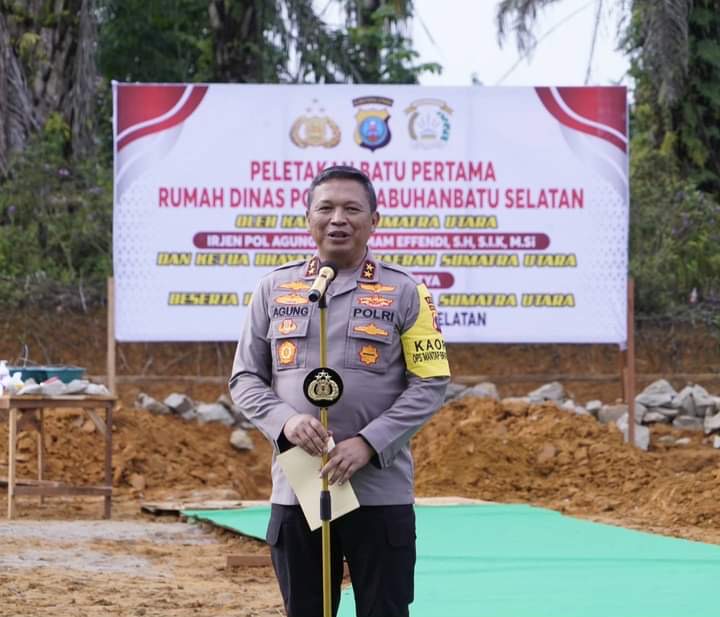 “Terimakasih pak Bupati, pak Kapolres yang sudah mempersiapkan Mapolres dengan sebaik-baiknya, hari ini kita akan membangun 2 unit rumah dinas Kapolres dan Wakapolres, 10 unit rumah dinas anggota Polres Labusel. Kami juga berterimakasih karena 5,3 hektar ini luas sekali”, ucap Kapolda