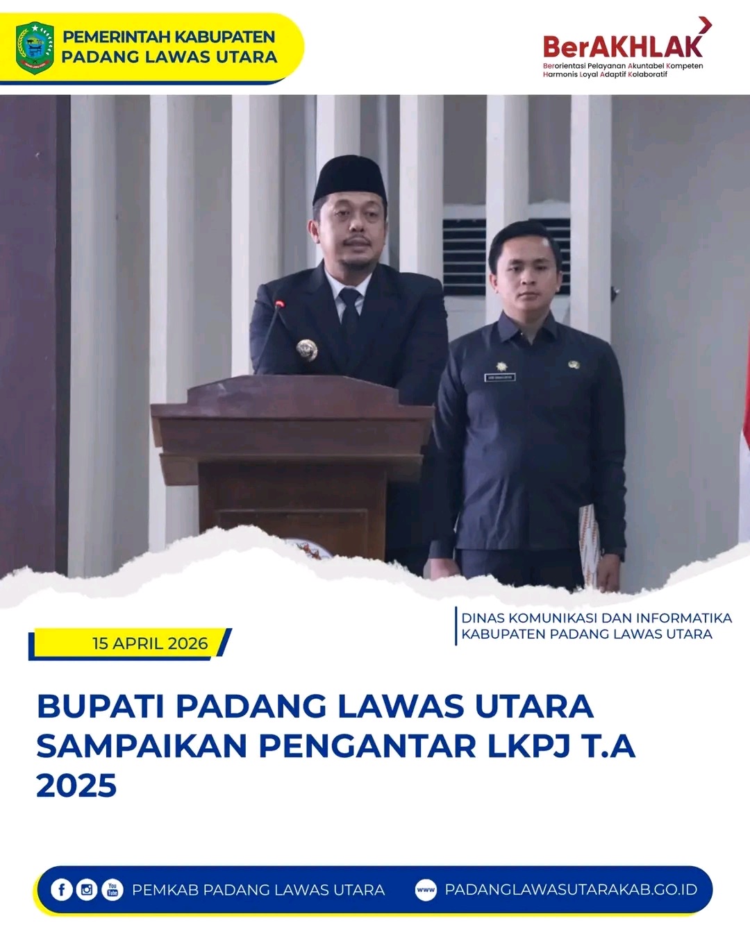 Bupati Padang Lawas Utara H. Reski Basyah Harahap, S.STP., M.Si secara resmi menyampaikan Pengantar Laporan Keterangan Pertanggungjawaban (LKPJ) Tahun Anggaran 2025 pada Rapat Paripurna pembicaraan tingkat I di Ruang Rapat DPRD Kabupaten Padang Lawas Utara, Rabu (15/4/2026).