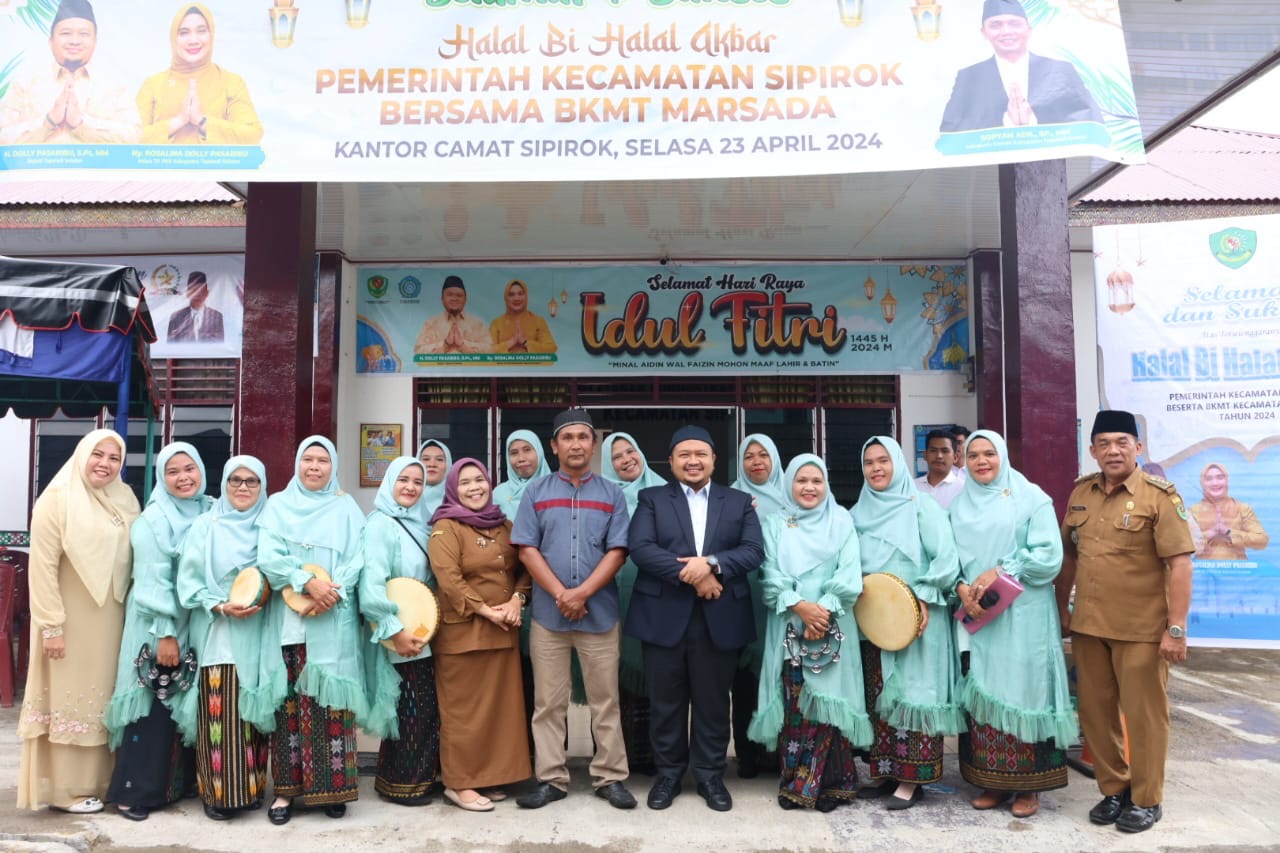 TAPANULI SELATAN – Bupati Tapanuli Selatan (Tapsel) Dolly Pasaribu menghadiri acara halal bihalal akbar Pemerintah Kecamatan Sipirok bersama BKMT Marsada di halaman Kantor Camat Sipirok, Rabu (24/4).