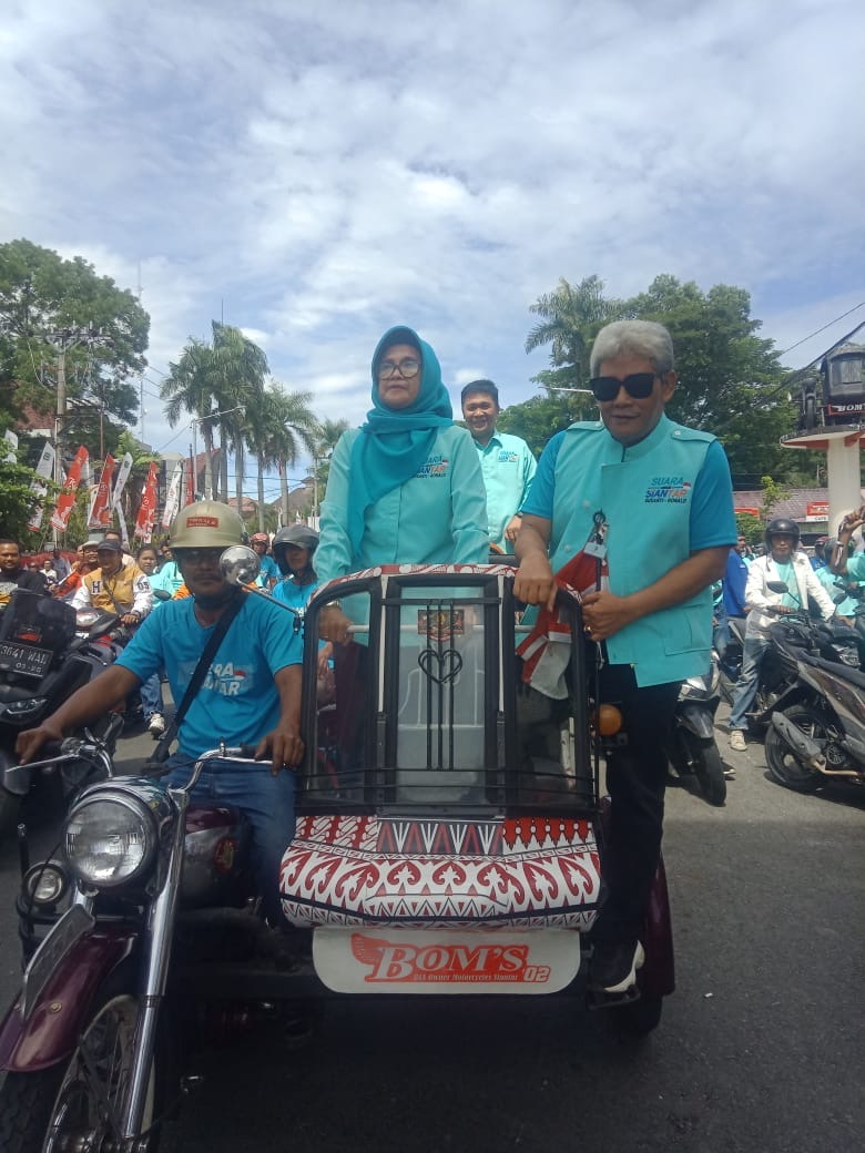 Rombongan pasangan calon ini, yang mengusung slogan “Suara Untuk Siantar,” disambut meriah oleh massa pendukung dari Pemuda Pancasila yang berbaur dengan simpatisan lainnya yang mengenakan baju bernuansa biru toska bertuliskan slogan yang sama. Kehadiran mereka menunjukkan dukungan solid terhadap pasangan dr Susanti Dewayani Spa dan Ronald Darwin Tampubolon SH.