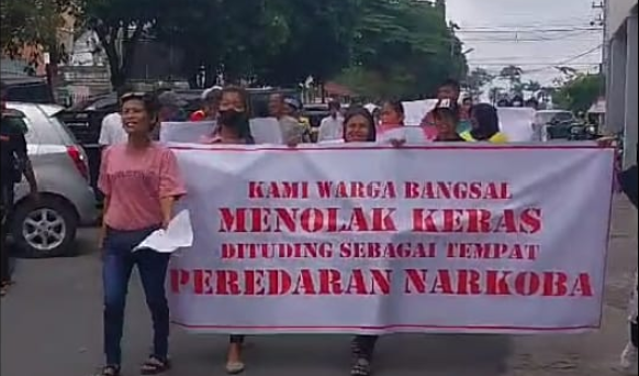 Dimulai dari Bangsal, sekelompok emak-emak berjalan sembari membawa spanduk bertuliskan, “kami warga bangsal menolak keras dituding sebagai tempat peredaran narkoba” dengan berjalan kaki menuju Polres Pematang Siantar.