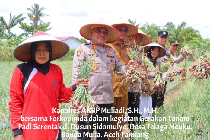 Aceh Tamiang, Tuntas News.net – Komitmen terhadap ketahanan pangan nasional kembali ditunjukkan oleh jajaran Forkopimda Aceh Tamiang pada Rabu, (23/04/2025), Kapolres Aceh Tamiang AKBP Muliadi, S.H., M.H. turut hadir dalam kegiatan Gerakan Tanam Padi Serentak di Dusun Sidomulyo, Desa Telaga Meuku, Kecamatan Banda Mulia, Aceh Tamiang.