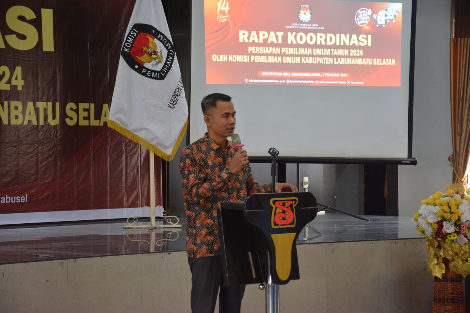 Labuhanbatu Selatan – Kapolres Labuhanbatu Selatan AKBP Maringan Simanjutak, S.H.,M.H., menghadiri Rapat Koordinasi Persiapan Pemilihan Umum (Pemilu) Tahun 2024 yang dilaksanakan oleh Komisi Pemilihan Umum (KPU) Kabupaten Labuhanbatu Selatan di aula Convention hall Hotel Grand Suma Blok Songo Desa Sisumut Kecamatan Kotapinang Kabupaten Labuhanbatu Selatan Propinsi Sumatera Utara, Rabu (7/2/2024).