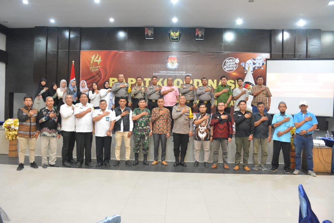 Hadir dalam rapat koordinasi tersebut Kapolres Labuhanbatu Selatan AKBP Maringan Simanjuntak, S.H.,M.H., Ketua KPU Labuhanbatu Selatan Saiful Bahri Dalimunthe, A.Md., Komisioner Bawaslu Labuhanbatu Selatan Divisi Penyelesaian Sengketa Saleh Jones Saragih Napitu, Mewakili Dandim Pabung Kodim 0209/Labuhanbatu MAYOR PH Purba, Kalapas Kelas III Kotapinang Edison Tampubolon, S.H., Kepala Dinas Dukcapil Kabupaten Labuhanbatu Selatan Drs.Lahamid, Kabid Kesbangpol Kabupaten Labuhanbatu Selatan M Irsyan, PJU Polres Labuhanbatu Selatan, Komisioner KPU Labuhanbatu Selatan, Kapolsek Sejajaran Polres Labuhanbatu Selatan, Pimpinan Partai Politik Se-Kabupaten Labuhanbatu Selatan, Tim Pemenangan Presiden/Wakil Presiden Nomor Urut 01 02 03, personel Sat Intelkam Polres Labuhanbatu Selatan.
