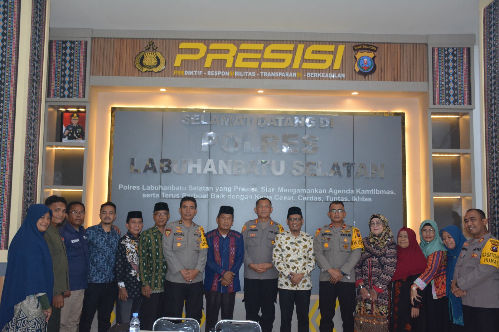 Kapolres Labuhanbatu Selatan AKBP. Maringan Simanjuntak SH., MH bersama Wakapolres Kompol Bambang Gunanti Hutabarat SH., MH, Kabag SDM Kompol. Edward Tobing SH., MH, Kasikum AKP.Sunipan Gurusinga SH, Kasat Intelkam AKP.Mampetua Situmorang SH, Kasi Humas Aiptu.Wesly Siahaan menerima rombongan antara lain ketua MUI Kabupaten Labuhanbatu Selatan H.Maratamin Harahap ,Ketua PD Al Washliyah Kabupaten Labuhanbatu Selatan Fery Andika Dalimunthe ST.,S.Kom , pengurus IPHI Kabupaten Labuhanbatu Selatan, Pengurus PMI Kabupaten Labuhanbatu Selatan.
