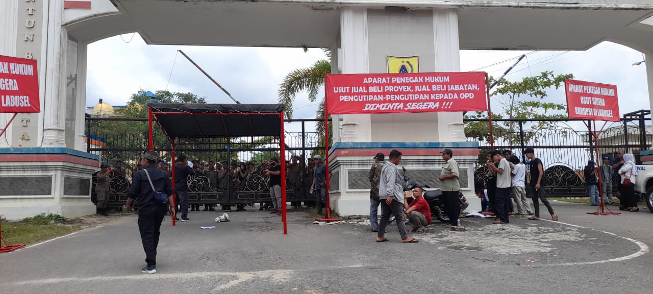 Pengunjuk rasa,memasang teratak dan sejumlah Poster didepan pintu gerbang Kantor Bupati yang bertuliskan,aparat penegak hukum usut tuntas kasus korupsi di labusel.Asiong Selesaikan semua hutang hutang,asiong selesaikan semua janji janji mu,serta sejumlah spanduk lainnya.