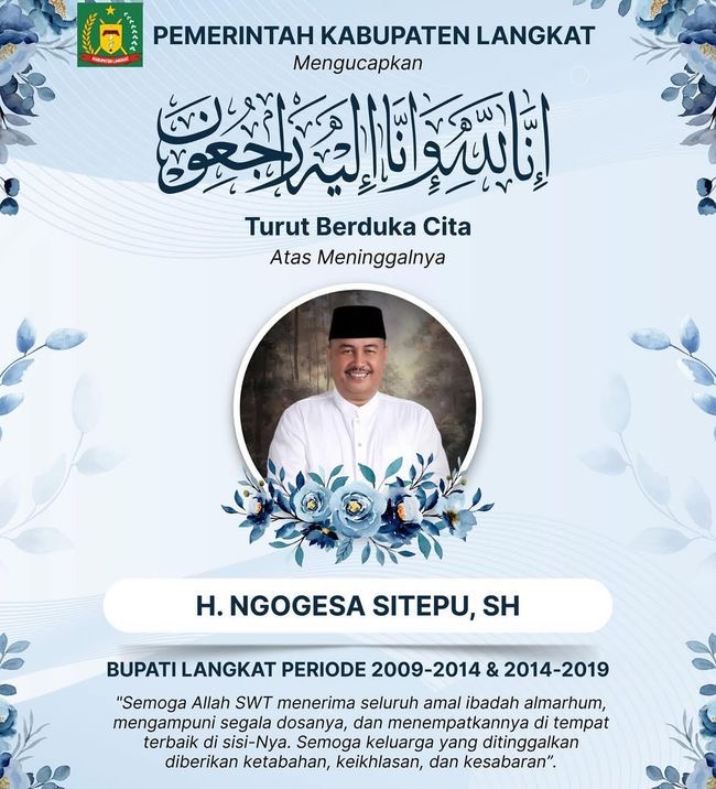 “Turut berduka cita atas meninggalnya H. Ngogesa Sitepu, Bupati Langkat periode 2009–2014 dan 2014–2019,” tulis unggahan Instagram resmi Dinas Komunikasi dan Informatika (Diskominfo) Langkat, Minggu (28/9/2025).