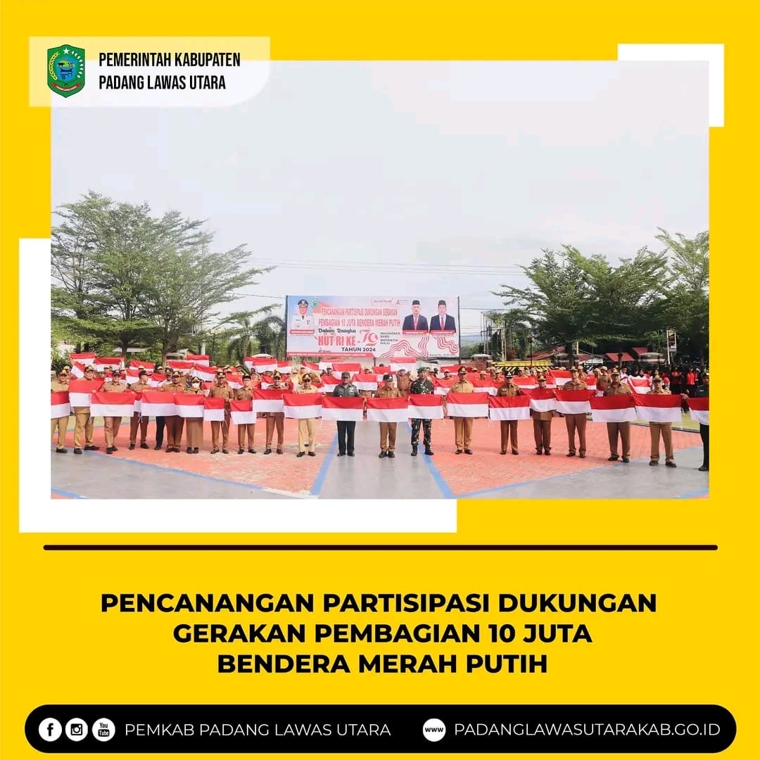 Gunung Tua – Pemerintah Kabupaten Padang Lawas Utara Mencanangkan Partisipasi Dukungan Gerakan Pembagian 10 Juta Bendera Merah Putih dalam rangka Menyemarakkan Hari Ulang Tahun ke-79 Kemerdekaan Republik Indonesia di Halaman Kantor Bupati Padang Lawas Utara, Senin (29/07/2024).