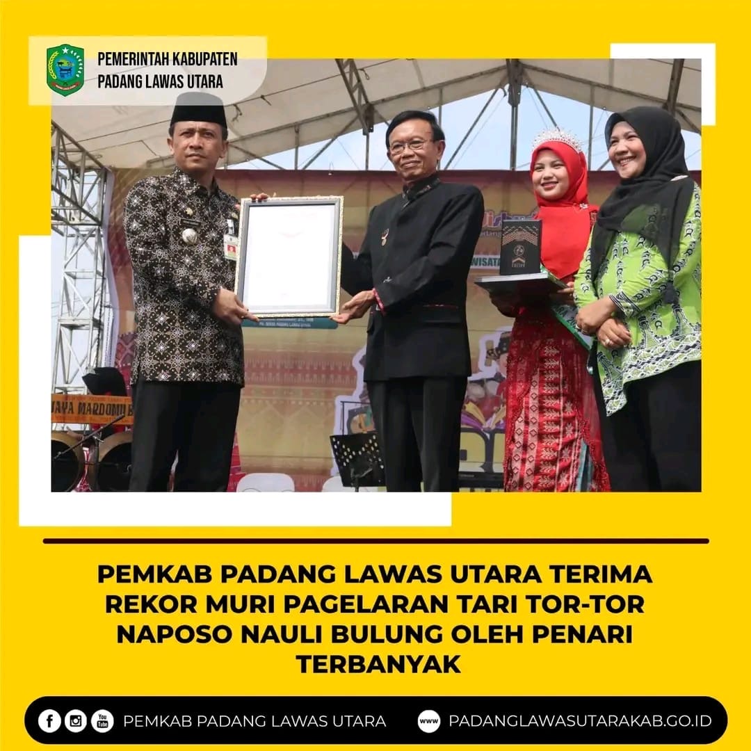 Gunung Tua – Pemerintah Kabupaten Padang Lawas Utara meraih Rekor Muri Indonesia melalui penampilan Tor-tor Naposo Nauli Bulung pada Gebyar Seni dan Budaya diikuti sebanyak 1556 Siswa/i Sekolah Dasar” yang berlangsung di Halaman Kantor Bupati Padang Lawas Utara, Rabu (26/06/2024).