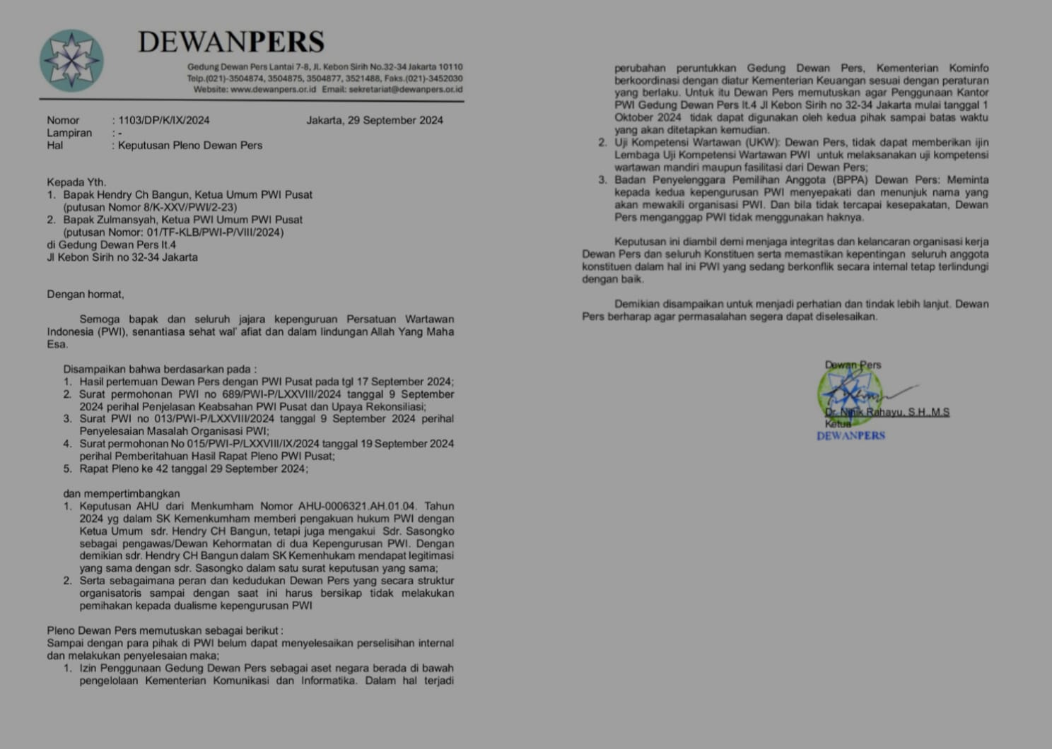 Hasil Pleno Dewan Pers ke-42 yang dilaksanakan pada 29 September 2024 menghasilkan sejumlah keputusan penting, di antaranya: