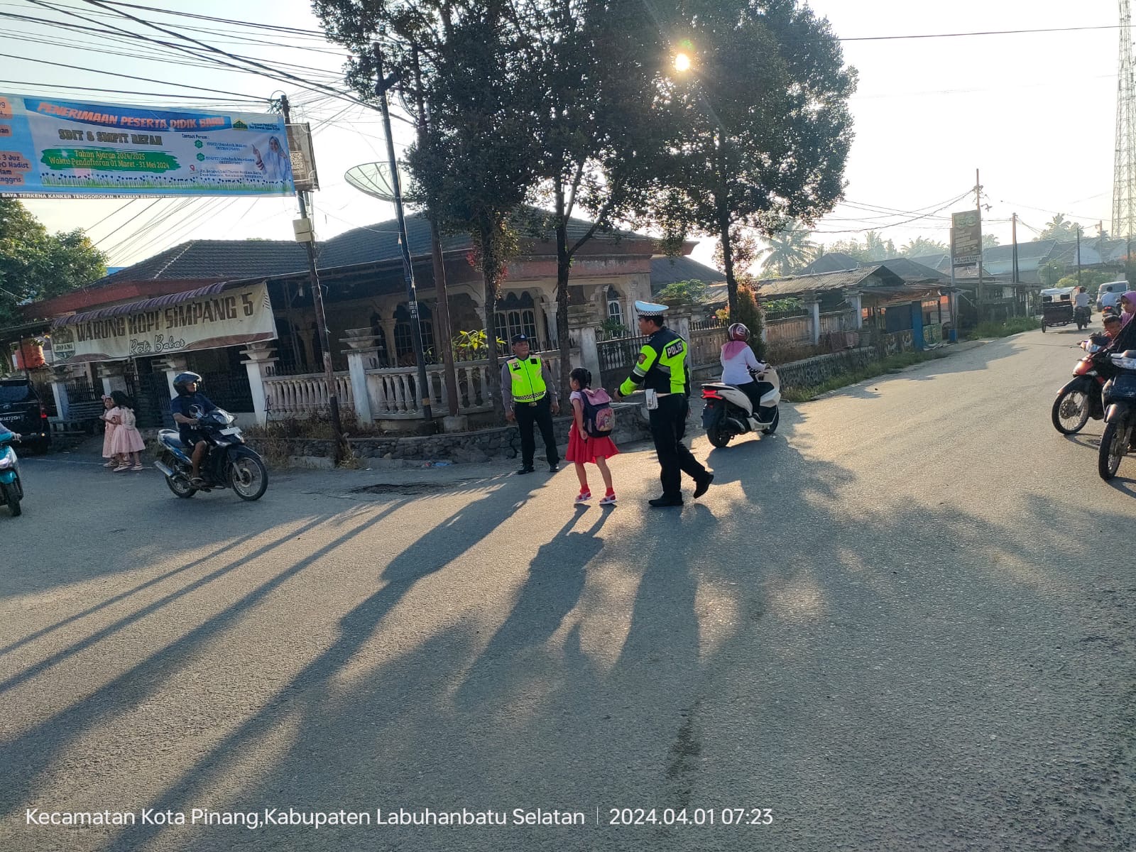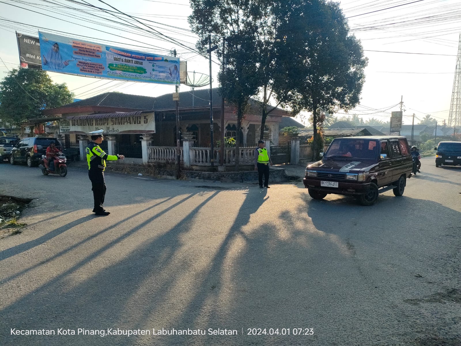 Labuhanbatu Selatan – Untuk memberikan rasa aman dan nyaman kepada pengguna jalan raya, dua personil Satuan Lalu Lintas Polres Labuhanbatu Selatan, yaitu AIPTU Budi Sihaloho dan AIPTU Leo Sinulingga, melaksanakan kegiatan Strong Point Pagi di sekitar Jalinsum wilayah Kecamatan Kotapinang, Kabupaten Labuhan Batu Selatan, Senin (1/4/2024).