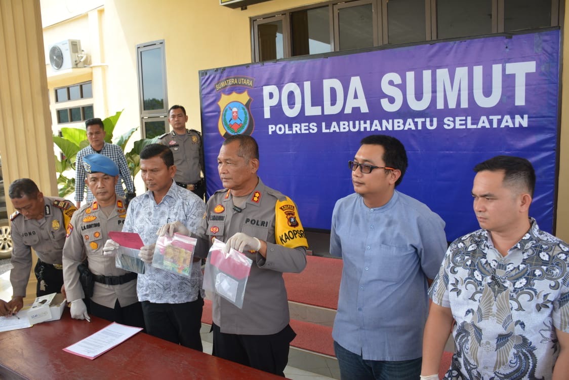 Kapolres Labuhanbatu Selatan AKBP Maringan Simanjuntak, S.H., M.H., yang didampingi Kasat Narkoba Polres Labuhanbatu Selatan AKP Endang R Ginting, S.H., M.H., Kasat Reskrim Polres Labuhanbatu Selatan AKP Gurbacov, S.I.K., M.H., M.Krim., Kasi Propam Polres Labuhanbatu Selatan AKP Iman Azhari Ginting, S.H., M.H., Kasi Humas Polres Labuhanbatu Selatan AKP Sujono, KBO Sat Narkoba IPTU Anwar Rasyid, Dokter Forensic RSUD Kotapinang Dr. Fernando Manik.