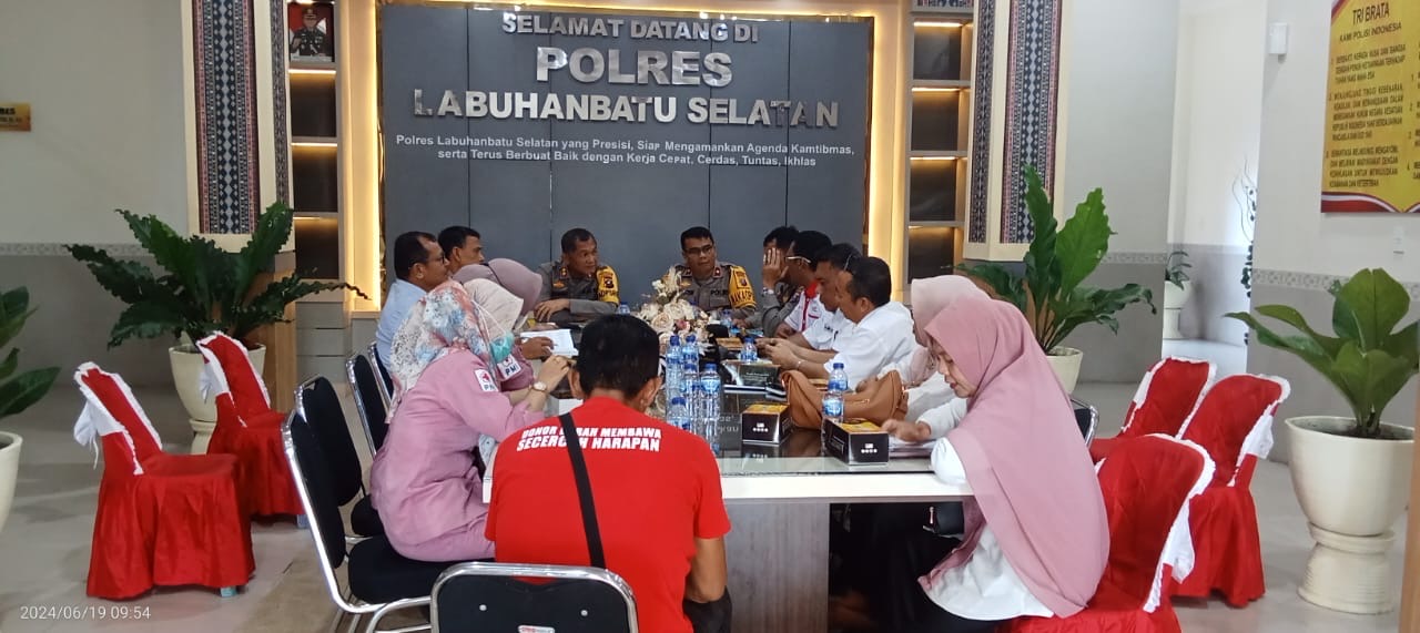 Labuhanbatu Selatan – Polres Labuhanbatu Selatan melaksanakan kegiatan Rapat Koordinasi bersama stakeholder dan instansi terkait dalam rencana kegiatan Bakti Sosial (Baksos) berupa donor darah, sunat massal dan lainnya dalam rangka menyambut HUT Bhayangkara yang ke-78 yang dilaksanakan di Lobi Polres Labuhanbatu Selatan, Rabu (19/6/2024).