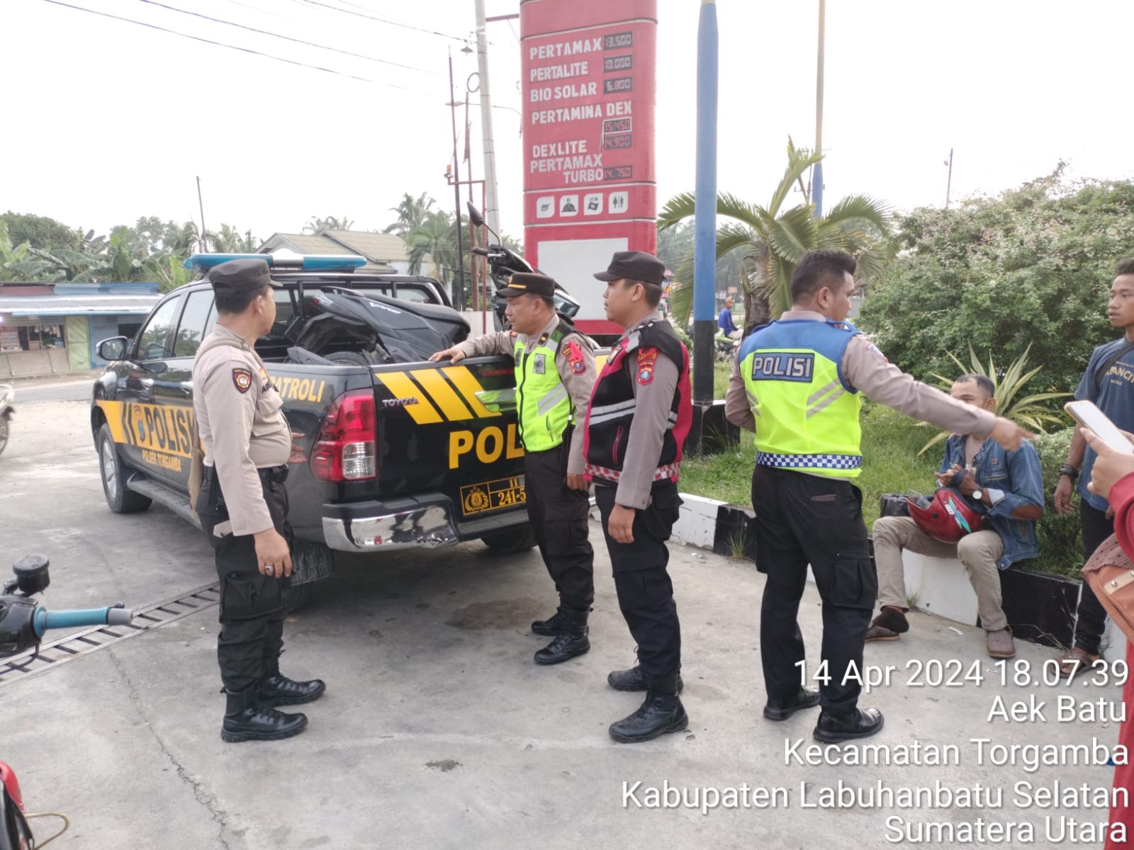 Labuhanbatu Selatan – Mendapatkan informasi dari petugas PAM Jalur, AIPTU Ismail Aswin bahwa telah terjadi kecelakaan lalu lintas di Simpang SPBU Simpang Karo Desa Aek Batu Kecamatan Torgamba Kabupaten Labuhanbatu Selatan, Minggu (14/4/2024), personel Pos PAM II Torgamba Polres Labuhanbatu Selatan langsung bergerak cepat ke lokasi Tempat Kejadian Perkara (TKP) yang disebutkan untuk memberikan pertolongan.
