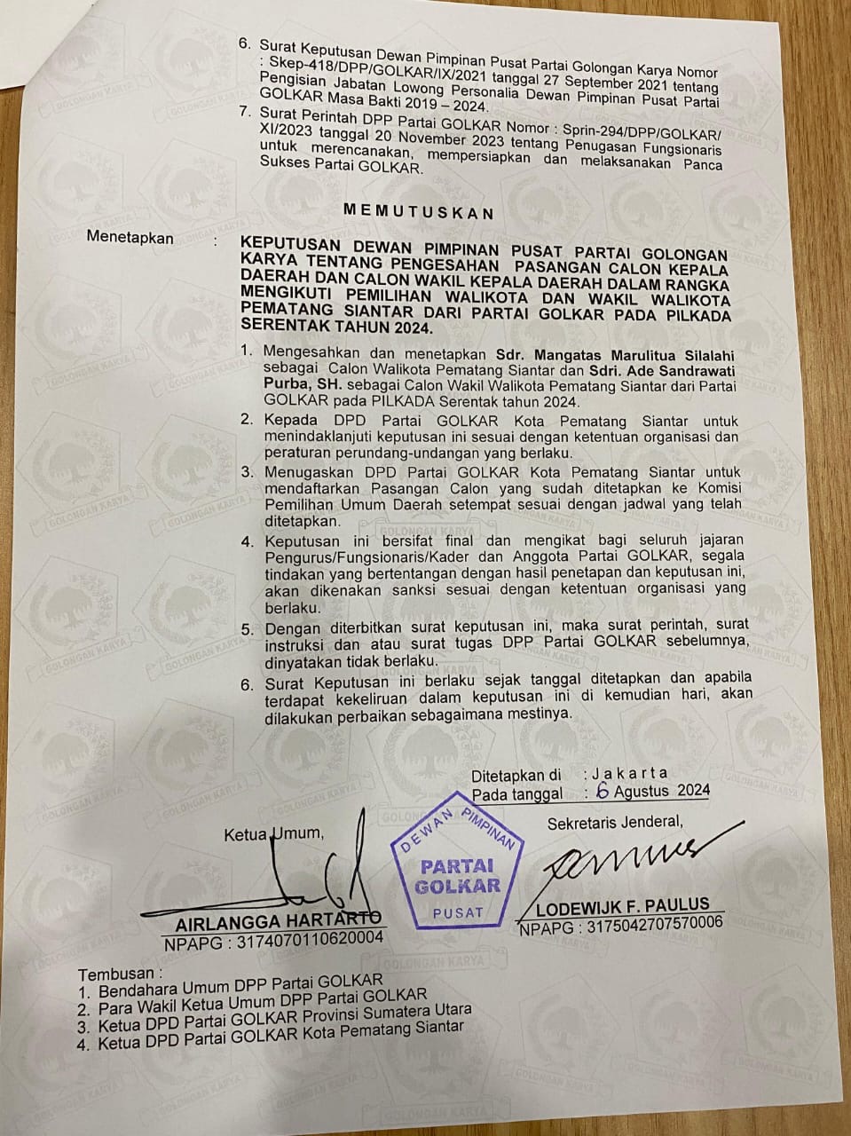 Dimana, surat tersebut memutuskan dan mengesahkan saudara Mangatas Marulitua Silalahi SE sebagai calon Walikota Pematangsiantar dan saudari Ade Sandrawati Purba SH sebagai calon Wakil Walikota Pematangsiantar dari Partai Golkar pada Pilkada Serentak 2024