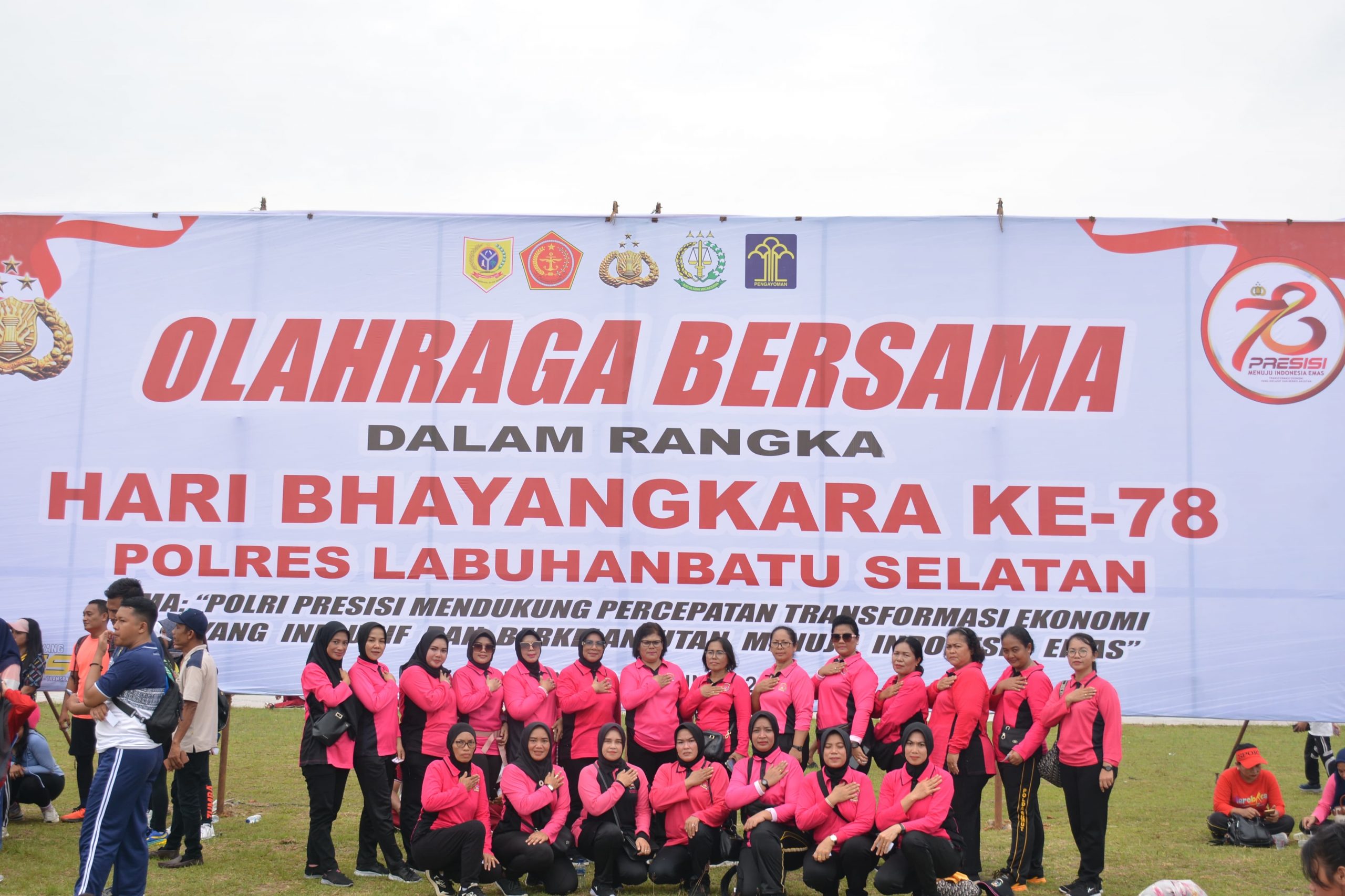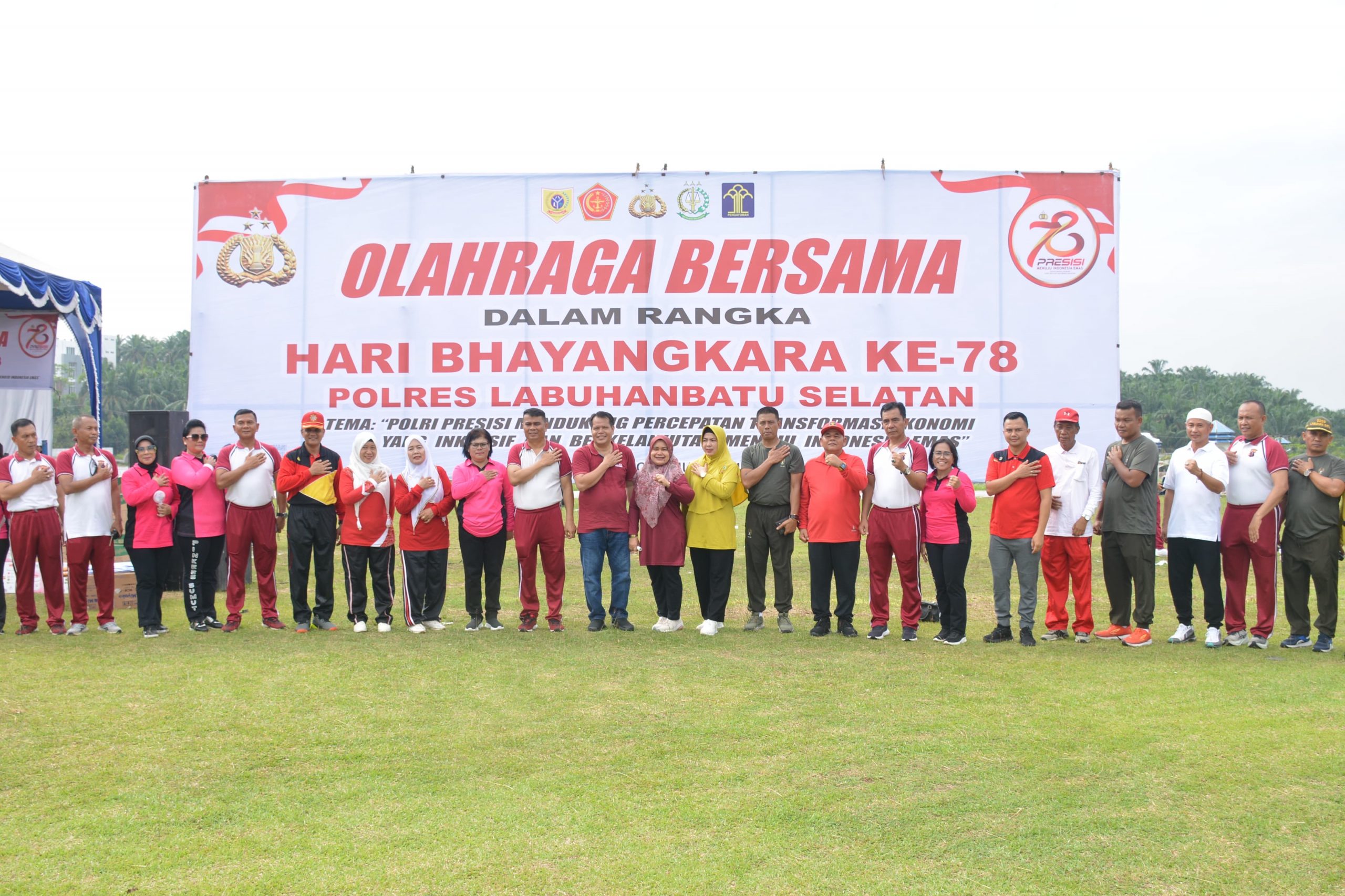 Labuhanbatu Selatan,Tuntasnews – Menjelang HUT Bhayangkara yang Ke-78 Tahun 2024, Polres Labuhanbatu Selatan melaksanakan kegiatan Olahraga Bersama Forkopimda Plus dan Stakeholder lainnya dengan Thema “POLRI Presisi Mendukung Percepatan Transpormasi Ekonomi Yang Inklusif Dan Berkelanjutan Menuju Indonesia Emas” dihalaman Apel Kantor Bupati Labuhanbatu Selatan jalan lintas Sumatera Kotapinang-Gunung Tua Desa Sosopan Kecamatan Kotapinang Kabupaten Labuhanbatu Selatan, Jumat (28/6/2024).