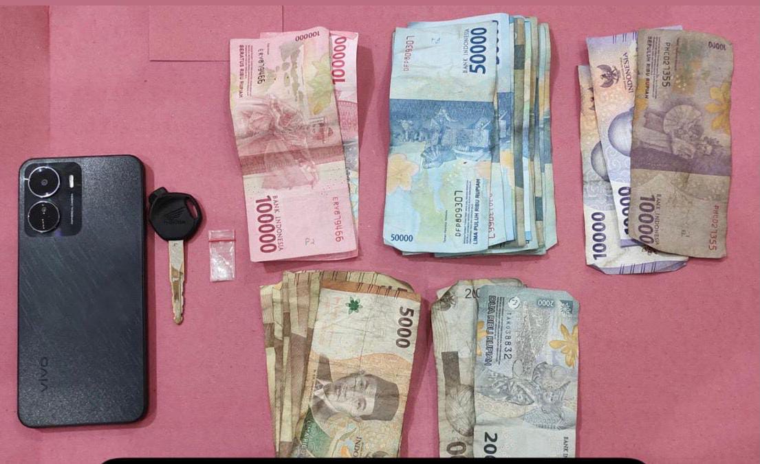 Selanjutnya dilakukan penggeledahan badan dan ditemukan barang bukti berupa 1 unit handphone Android merk Vivo warna hitam dan uang tunai senilai Rp.974.000,- dari kantong celana pelaku”.ujar Kapolsek Kotapinang KOMPOL R. G. M. Hutagalung, S.H.