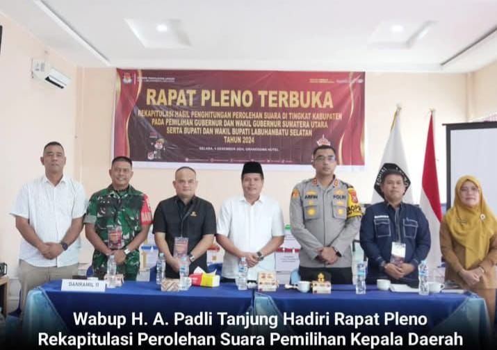 Labuhanbatu Selatan-Tuntasnews – Wakil Bupati H. Ahmad Padli Tanjung S.Ag menghadiri Rapat Pleno Terbuka Rekapitulasi Hasil Perhitungan Perolehan Suara Pemilihan Gubernur Dan Wakil Gubernur Sumatera Utara Serta Bupati dan Wakil Bupati Labuhanbatu Selatan Tahun 2024 digelar di Cendana Hall Grandsuma Kecamatan Kotapinang, Selasa (03/12/2024).
