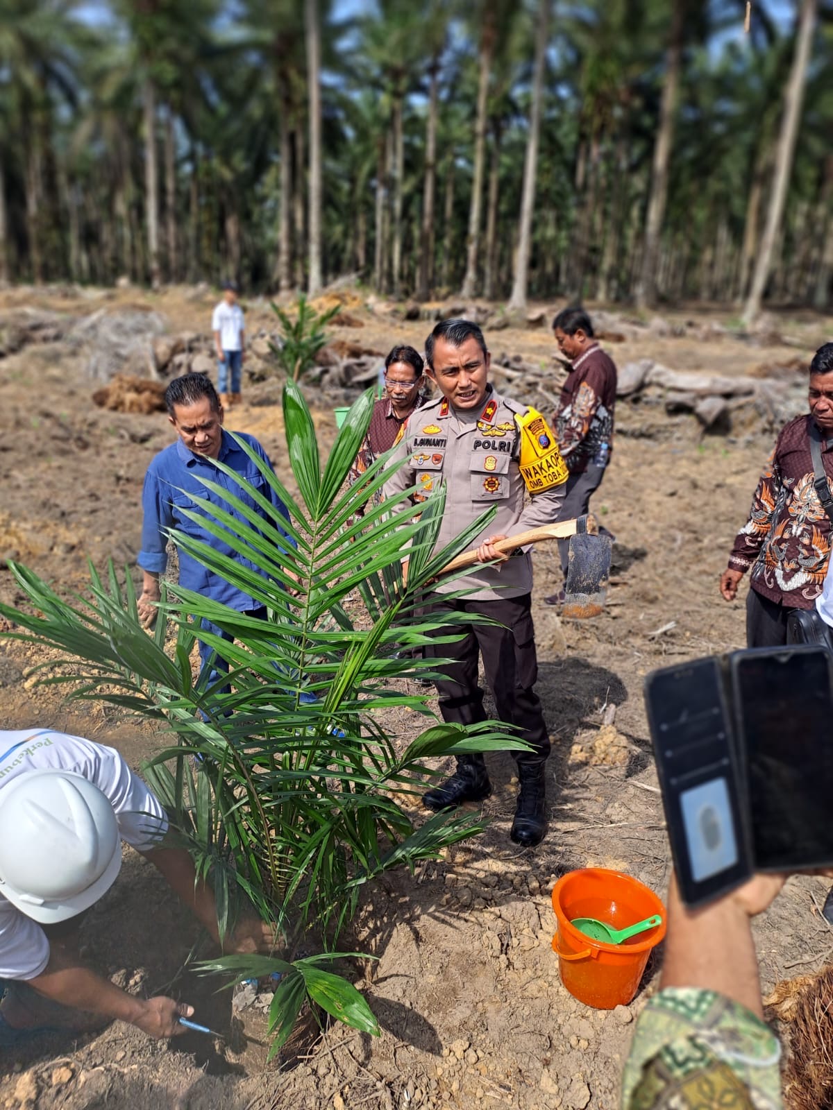 Labuhanbatu Selatan – Kapolres Labuhanbatu Selatan AKBP Maringan Simanjuntak, S.H., M.H., yang diwakili Wakapolres KOMPOL Bambang Gunanti Hutabarat, S.H., M.H., menghadiri pelaksanaan kegiatan Penanaman Perdana Program Peremajaan Sawit Rakyat (PSR) jalur kemitraan perkebunan antara PTPN IV Regional I dengan Gapoktan Perkebunan Aek Raso Maju Bersama yang dilaksanakan di AFD VII Pirbun Aek Raso Desa Aek Raso Kecamatan Torgamba Kabupaten Labuhanbatu Selatan Propinsi Sumatera Utara, Kamis (7/3/2024).