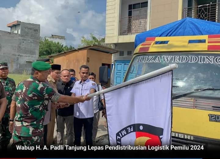 Labuhanbatu Selatan – Wakil Bupati Labuhanbatu Selatan (Labusel) H. Ahmad Padli Tanjung, S.Ag melepas armada pendistribusian logistik Pemilu tahun 2024, yang berlangsung di halaman Kantor KPU Labusel, Senin (12/02/2024).