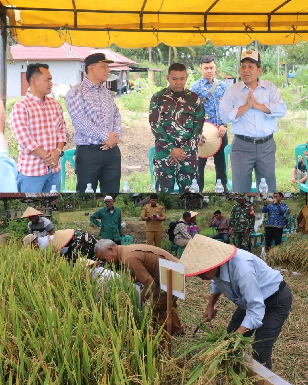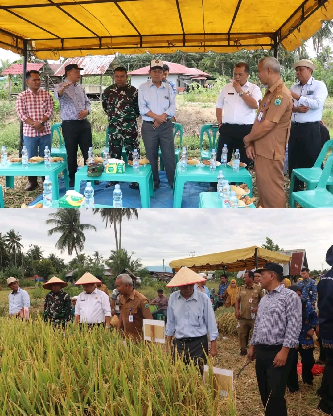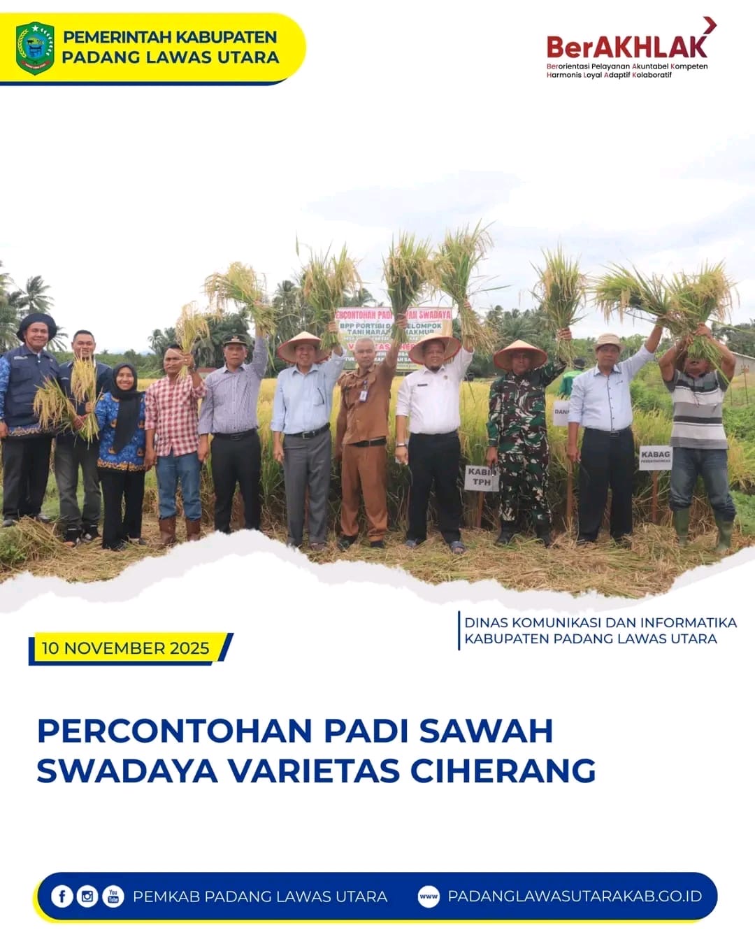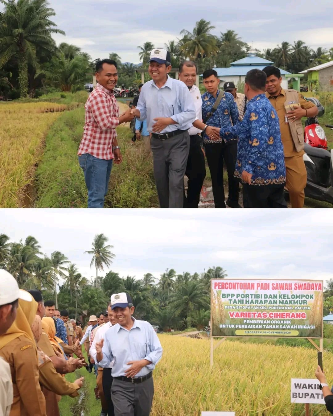 Wakil Bupati Padang Lawas Utara Basri Harahap melaksanakan Percontohan Padi Sawah Swadaya Varietas Ciherang untuk Pemberian Organik untuk Perbaikan Tanah Sawah Irigasi oleh BPP Portibi dan Kelompok Tani Harapan Makmur di Desa Sitopayan, Senin (10/11/2025).